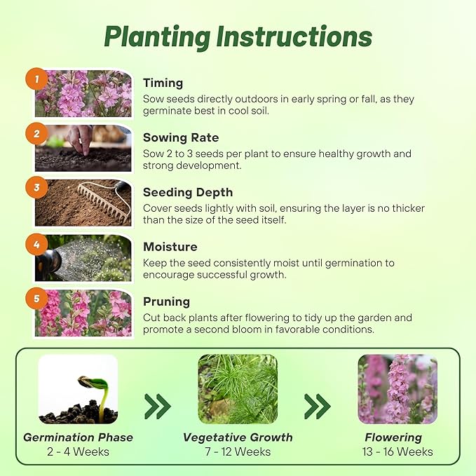 - PLANTING MADE EASY: Our recommended seeding rate is 7 ounces per 1,000 square feet or 18 pounds per acre. For ideal growth, sow Delphinium live plants outdoor at a depth of 1/4 inch in moist, well-drained soil, ensuring your Larkspur flourishes and ideal choice among fast growing flower seeds.