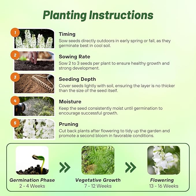 - PLANTING MADE EASY: Our recommended seeding rate is 7 ounces per 1,000 square feet or 18 pounds per acre. For ideal growth, sow Delphinium live plants outdoor at a depth of 1/4 inch in moist, well-drained soil, ensuring your Larkspur flourishes and ideal choice among fast growing flower seeds.