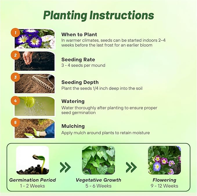 - EASY TO GROW & LOW MAINTENANCE: Our morning glory seeds for planting germinate in 7-21 days at 70°F with proper preparation. To improve germination, nick the untreated seeds and soak them overnight before planting. Sow 6-8 seeds per foot, cover with ¼ inch of soil, and thin seedlings to 12 inches apart to promote strong, healthy growth, ensuring a lush and flourishing vine.