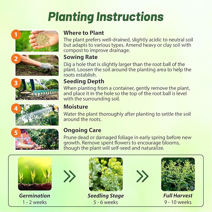 - RESILIENT AND EASY TO GROW: Lady’s Mantle is unwanted by deer, making it a great choice of perennial flower plants for gardens. Easy to grow, you can start by sowing 2-3 seeds per plant using well drained soil with 18 inch spacing at 1/8 inch depth under 72F to germinate for 22-28 days. Its resilience and simplicity make it a great choice of seeds for any skilled gardeners.