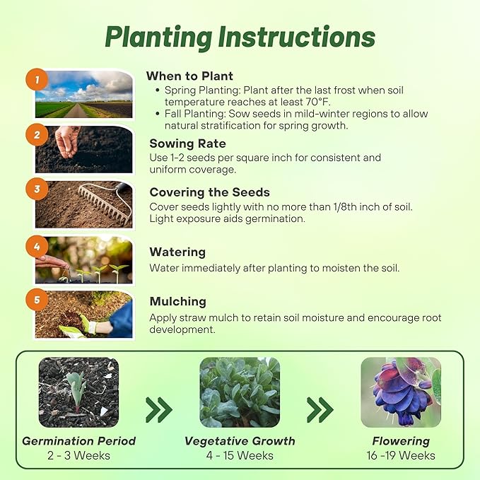 - EASY TO GROW FOR CONTINUOUS BLOOMS : Our Honeywort flower seed blooms from spring into fall, offering months of color and beauty. It’s easy to grow from seed by sowing 1-2 seeds per plant with 18 inch spacing at 1/8 inch depth under 68F to allow a germination time of 14-21 days. The plant is hardy, durable, ensuring a vibrant garden with minimal upkeep.