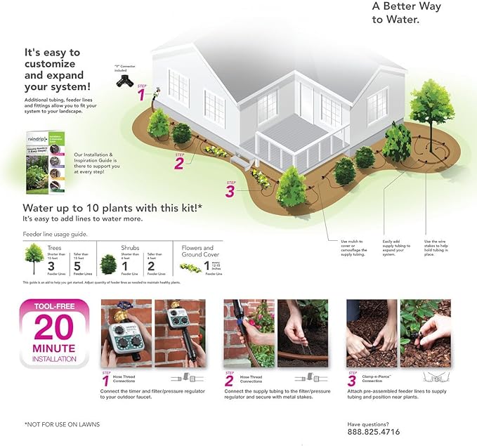 - INSTALL IN 3 STEPS: 1) Connect timer and tubing to water source. 2) Lay out tubing. 3) Use fittings to attach drippers. Customizable system for flowers, shrubs, and trees