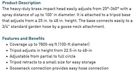 - LARGE-AREA COVERAGE: Sprays up to 80 feet in diameter, covering 5,026 square feet when set to a full circle.