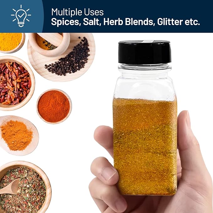 - Multi-Purpose: Our clear plastic jars are perfect for storing dried spices, salt, peppers, seasonings, herb blends, powder, glitter, bath salts, crafts, etc.