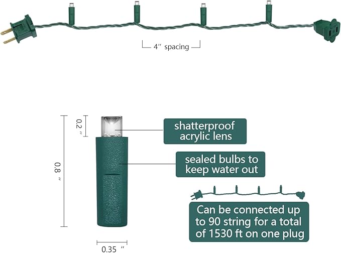 - The mini amber LED lights are connectable end to end and can be connected up to 90 strings for a total of 1530 ft on one plug.
