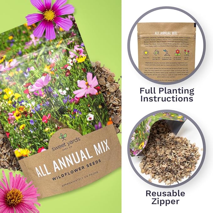 Bulk Wildflower Seeds Annual Quick Blooming Mix - 1/4 Pound Bag - Over 30,000 Open Pollinated Seeds