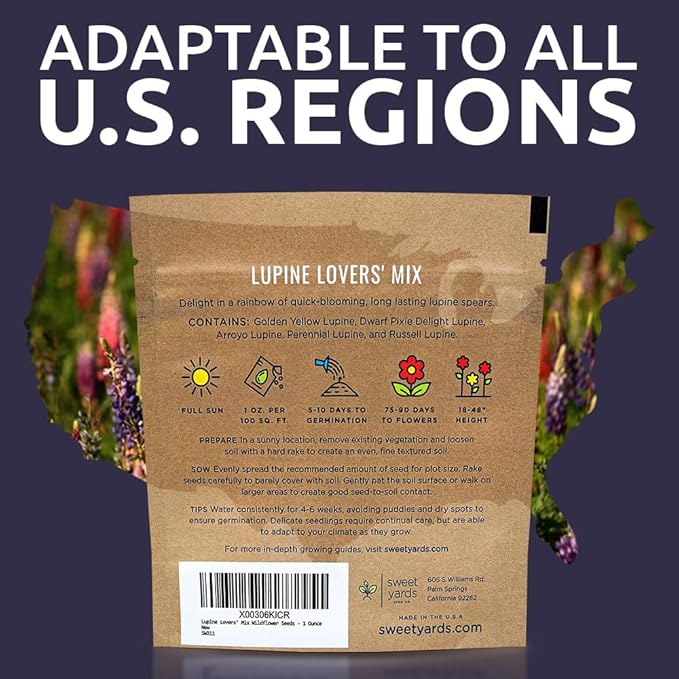 - Magnificent towering blooms from 5 lupine species: Arroyo, Perennial, Dwarf Pixie Delight, Golden Yellow and Russell Lupine; Shades of white, blue, pink, purple, and yellow