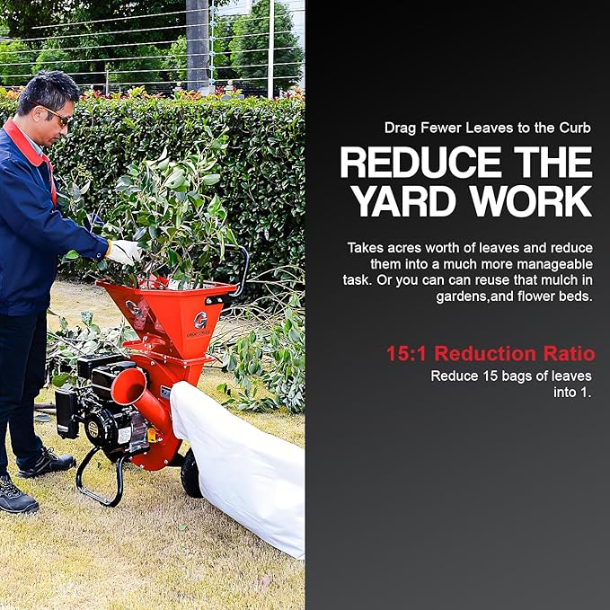 - MULTI-FUNCTION CAPABILITY - This 3-in-1 Wood Chipper Shredder Mulcher design has a Reduction Ratio of 15:1 when using the top Hopper for 1/2" MAX volume Chipping/Shredding; Side Chute for 3" MAX branch/limbs, or the attachable leaf vacuum for mulching. professional design w/ CR12MoV cutting blades.