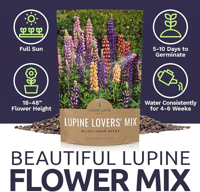 - Magnificent towering blooms from 5 lupine species: Arroyo, Perennial, Dwarf Pixie Delight, Golden Yellow and Russell Lupine; Shades of white, blue, pink, purple, and yellow