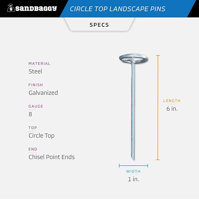 - EASIEST STAPLE TO INSTALL: If you’re not an expert at using a rubber mallet, these landscaping pins will be a time saver! Unlike standard landscape staples with a thin area to nail in the staple, these wide one inch circular steel top makes missing the target much harder. Plus with sharp chisel point ends, these landscape stakes penetrate even the hardest of soils. Get the job done faster with these circle top landscape pins!