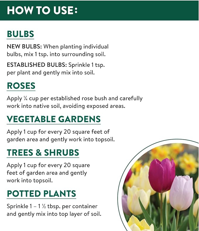 - IDEAL FOR FALL BULB PLANTING: Bone meal naturally promotes healthy growth of root and bulb crops and has a fine granular consistency for easy spreading. You can also use when planting flowering bulbs in the fall, such as tulips. Plus, it's Made in the USA!
