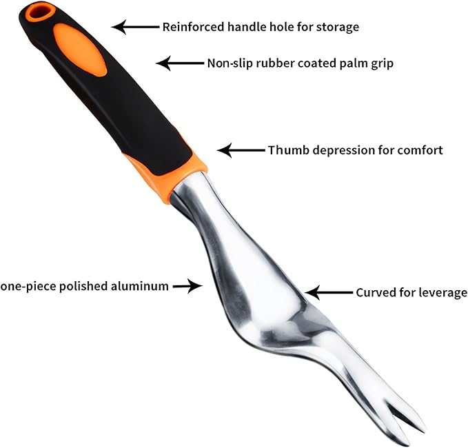 - Easy to Use: This transplant weeder tool is easy to use, simply rest the curved metal base on the ground and dig around the roots to pull, use the point fork tip to dig and pry the roots, stem and leave, by eliminating the roots you will get rid of the weed once, can save you much time and effort to deal with the weed.