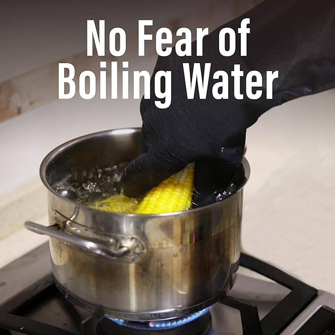 - Smooth Hot Liquid & STEAM Management: Experience effortless food extraction from hot boiling water or steam with these gloves, ensuring secure and easy handling. The waterproof neoprene coating offers a reliable grip, enhancing convenience in various cooking tasks, like dipping a chicken in hot water (Please conduct a cold water test to check for potential defective gloves).