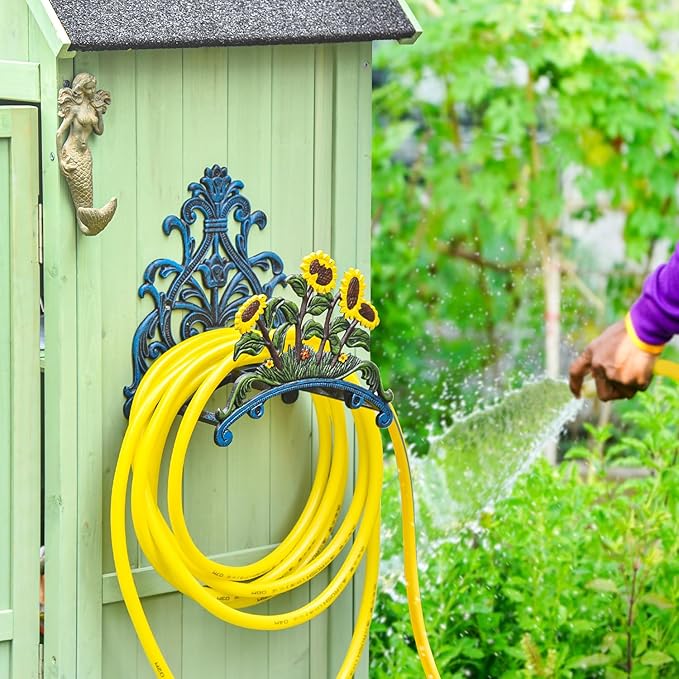 Sungmor Cast Iron Heavy Duty Garden Hose Holder - Decorative Hand-Painted Sunflower Wall Mounted Water Hose Hanger - Wall Decoration Hanging Hose Rack - Hose Reel Storage Butler - Metal Hose Stand