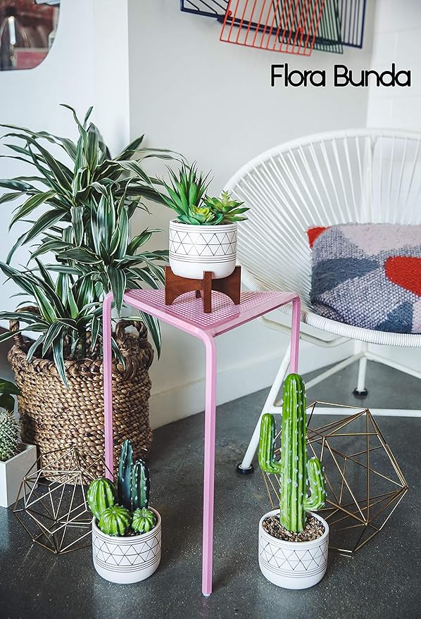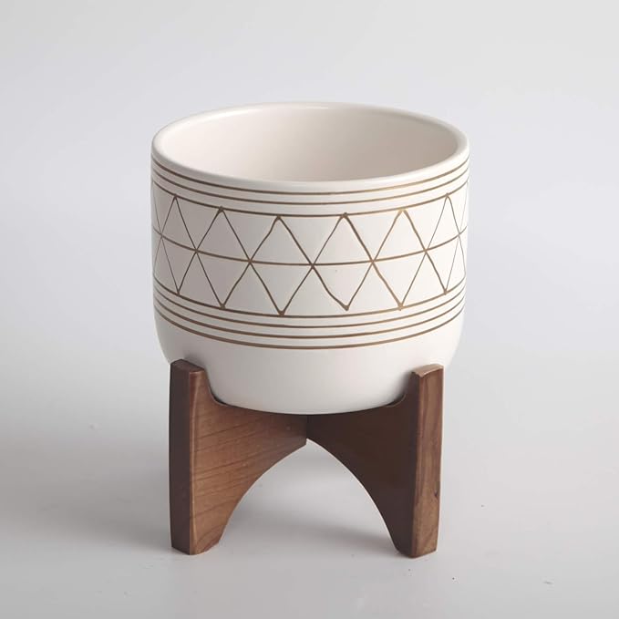- DESIGN - Wood stand is attached to the ceramic planter, no assembly required (Plants not included). White geometric patterns and neutral colors blend with any style room. Durable wood legs that is great for display or for holding houseplants. There is no drainage hole, so no spill and no mess! You can start your own little Garden indoors! Dress up your plant for a Mid Century Modern, Boho-chin, Rustic, Farmhouse, modern look.