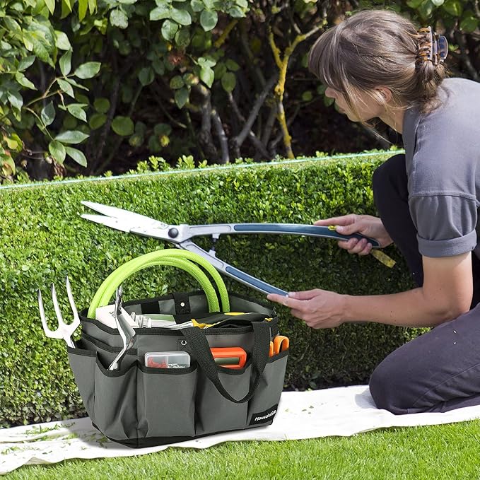 Housolution Gardening Tote Bag, Deluxe Garden Tool Storage Bag and Home Organizer with Pockets, Wear-Resistant & Reusable, 14 Inch, Gray + Black