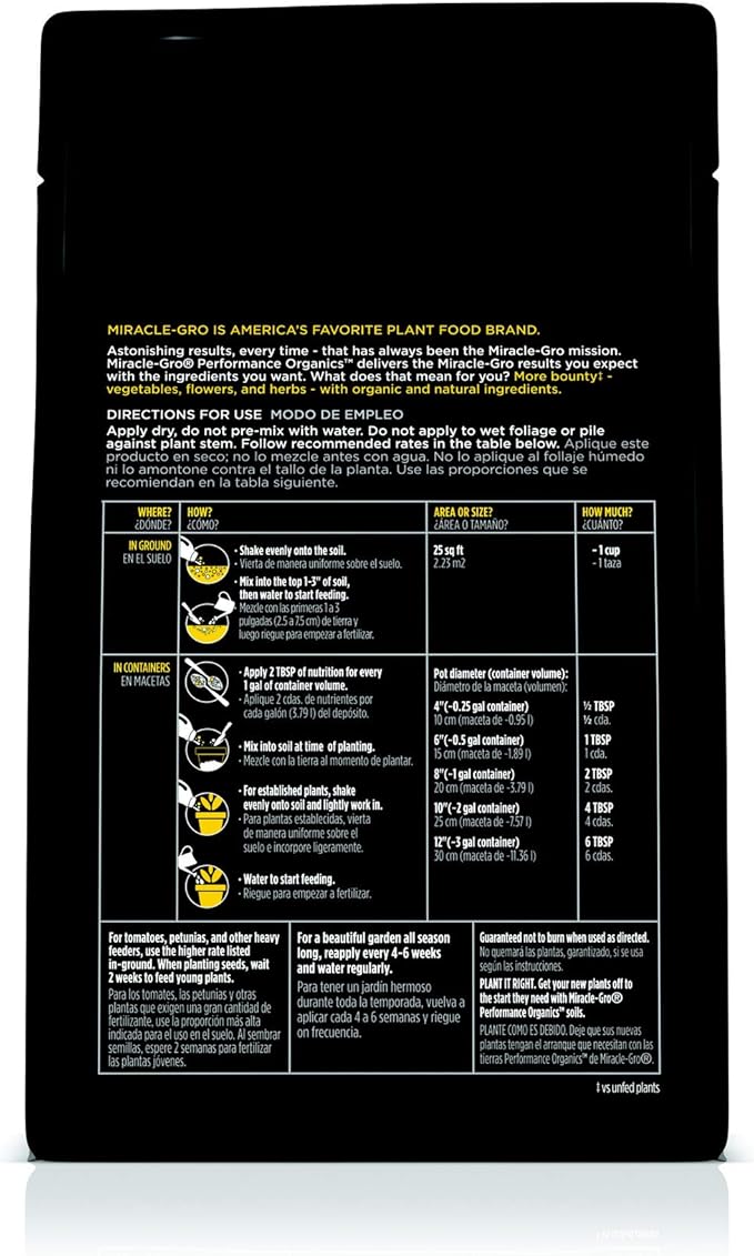- Use Miracle-Gro Performance Organics All Purpose Plant Nutrition Granules to feed your plants, flowers, vegetables, and herbs - just sprinkle directly from the bag to apply