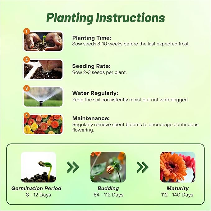 - VIBRANT MIXED BLOOMS: Brighten your garden with the stunning colors of Autumn Colors Mix Gerbera Daisy Seeds in vibrant mixed shades. With deep green foliage, our large dazzling flowers add a pop of charm and elegance, transforming any indoor and outdoor space into a colorful oasis. Perfect for garden beds, pots, or as cut flowers, their bold, eye-catching appeal is sure to impress.