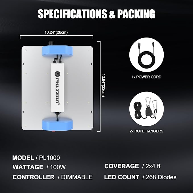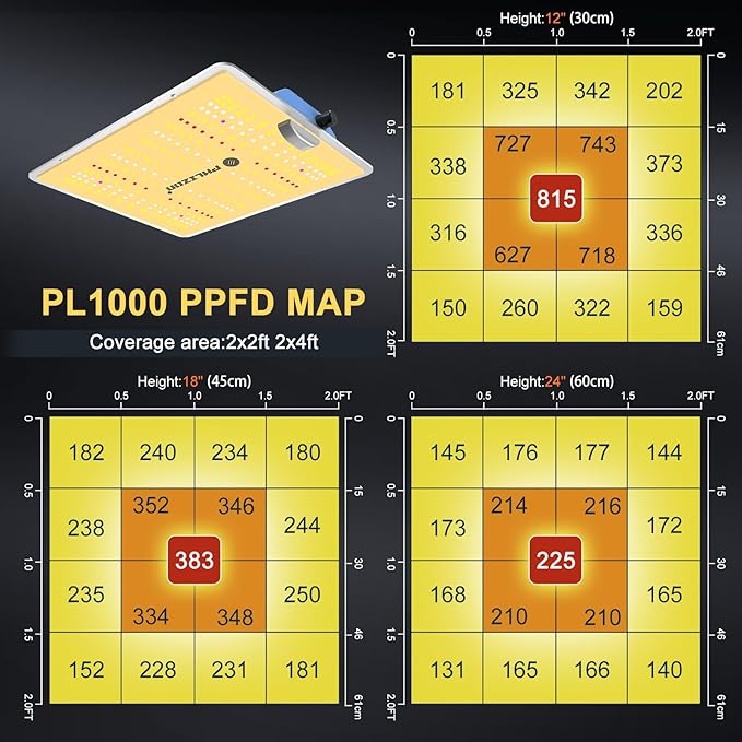 - ENERGY EFFICIENCY-The grow light compares to traditional 1000W HPS/MH while consuming only 100W!, light efficacy is up to 2.8 umol/W, light output PPFD value is 500 umol/m² hanging at 18", grow light is designed to replace tranditional HPS , lower temperature , more scientifically and energy-efficient. making you get 30% higher yield than HPS. Perfect for 2x2ft 3x3ft 2x4ft growing area, higher intensity in a Phlizon mylar grow tent