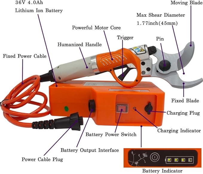 VIDAR Wired Electric Pruning Shears - 36V 4Ah Rechargeable Lithium Battery Powered Tree Branch Pruner 1.77Inch with Free Blades Maintenance Kit