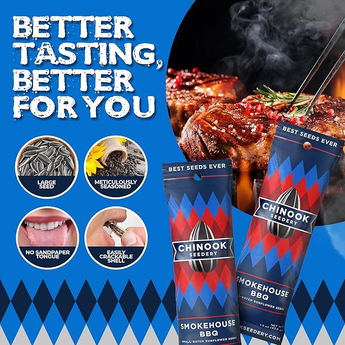 Chinook Seedery Low Sodium Sunflower Seeds – Smokehouse BBQ Flavor, Pack of 36, 1.5oz – Sunflower Seeds to Eat – Keto, Jumbo, Roasted, Baseball Snacks