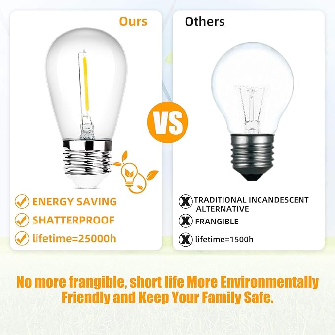 - Dimmable and Long Life: The string lights compatible with most dimmers (not included) to adjust the brightness for any occasion. Each bulb operates independently on a parallel circuit, so if one bulb burns out, the rest remain unaffected, ensuring continuous lighting enjoyment