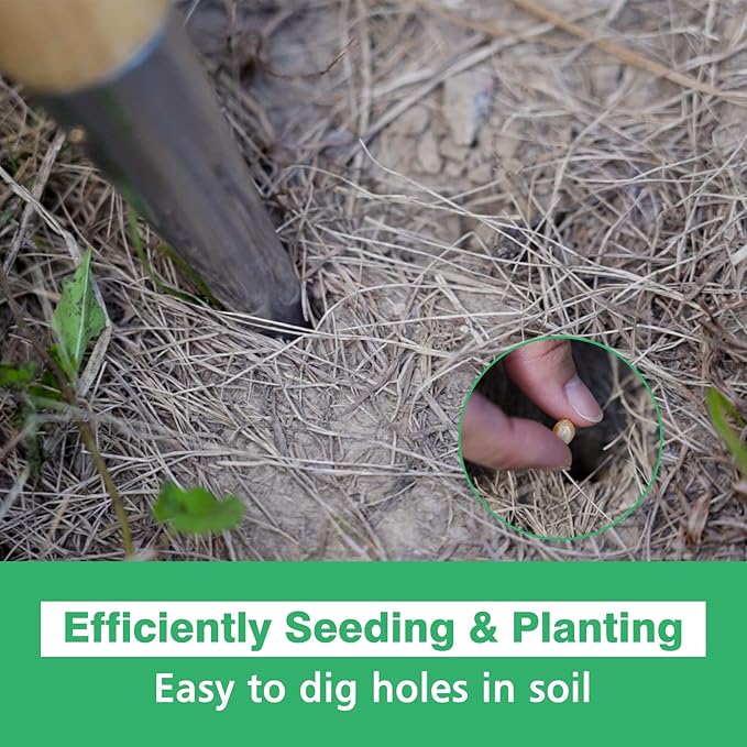 - ERGONOMIC WOODEN HANDLE - We created T-handle with a stainless steel tip to break through hidden underground obstacles, thus saving time and energy. The seed digging tool is designed with a light wooden handle, so you can easily hold it. The T-handle can be easily put into the hand to make turning easier.