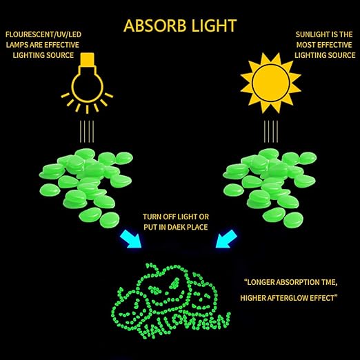 - GLOW IN THE DARK PEBBLES: These glowing rocks absorb and store energy from sunlight and other light sources,light up in dark environments. These glowing pebbles can glow for up to 1 to 2 hours in darkness after a full day in the sun.These glow stones are green in the day, but they are going to be Blue glow pebble rocks at night! Please radiate them with light again if they are not bright enough.