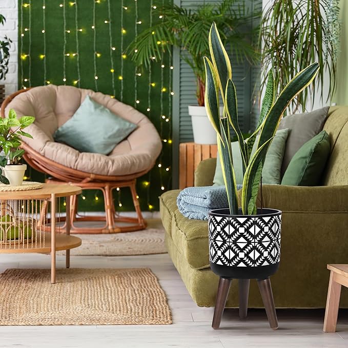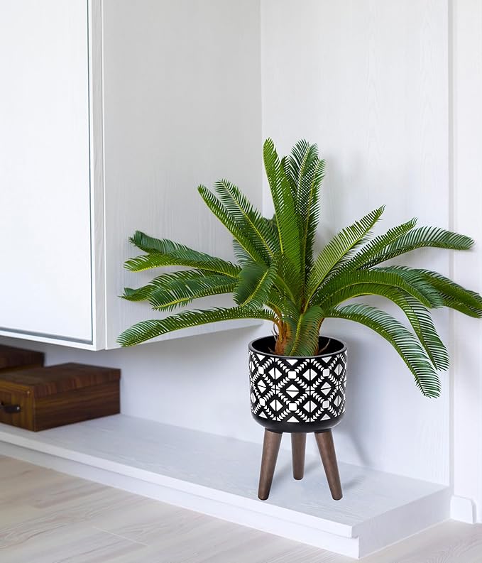 - Sophisticated Design: Mid-century modern aesthetic with a geometric fiberclay pot, complemented by solid wooden legs.