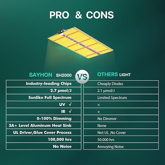 - 🌿 Ideal Cooling System: Full coverage 3A+ level aluminum heat sink can lower temperatures 50°F greater than other brands, Sayhon led grow light maintain brightness at 95%+ after 3 years of use.