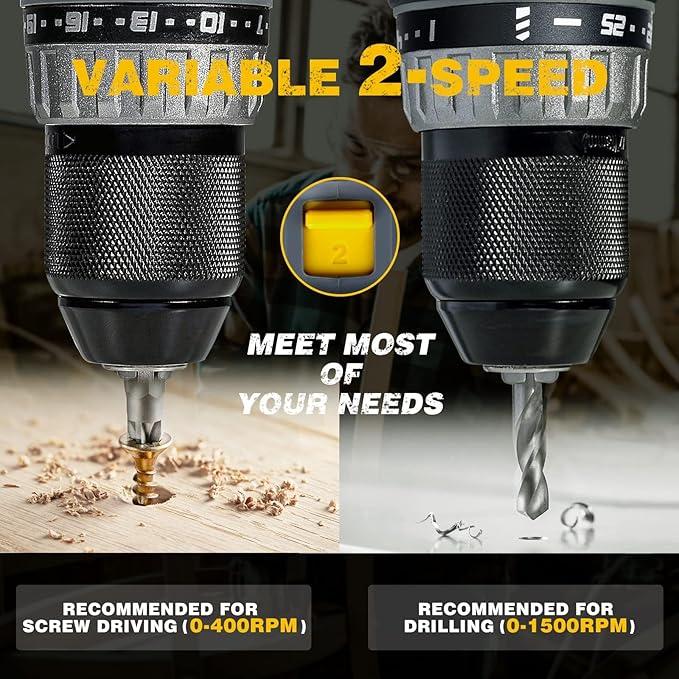 - ⚡【1/2" Metal Chuck & 2-Speed Control】RIDA's cordless drill features a 1/2" (2-13mm) keyless metal chuck with spindle lock for one-handed bit changes. With 2-in-1 functionality (0-400 RPM for screwdriving / 0-1500 RPM for drilling) and 25+1 torque settings, it's the ultimate all-rounder for pros and DIYers tackling construction, repairs, and daily tasks.