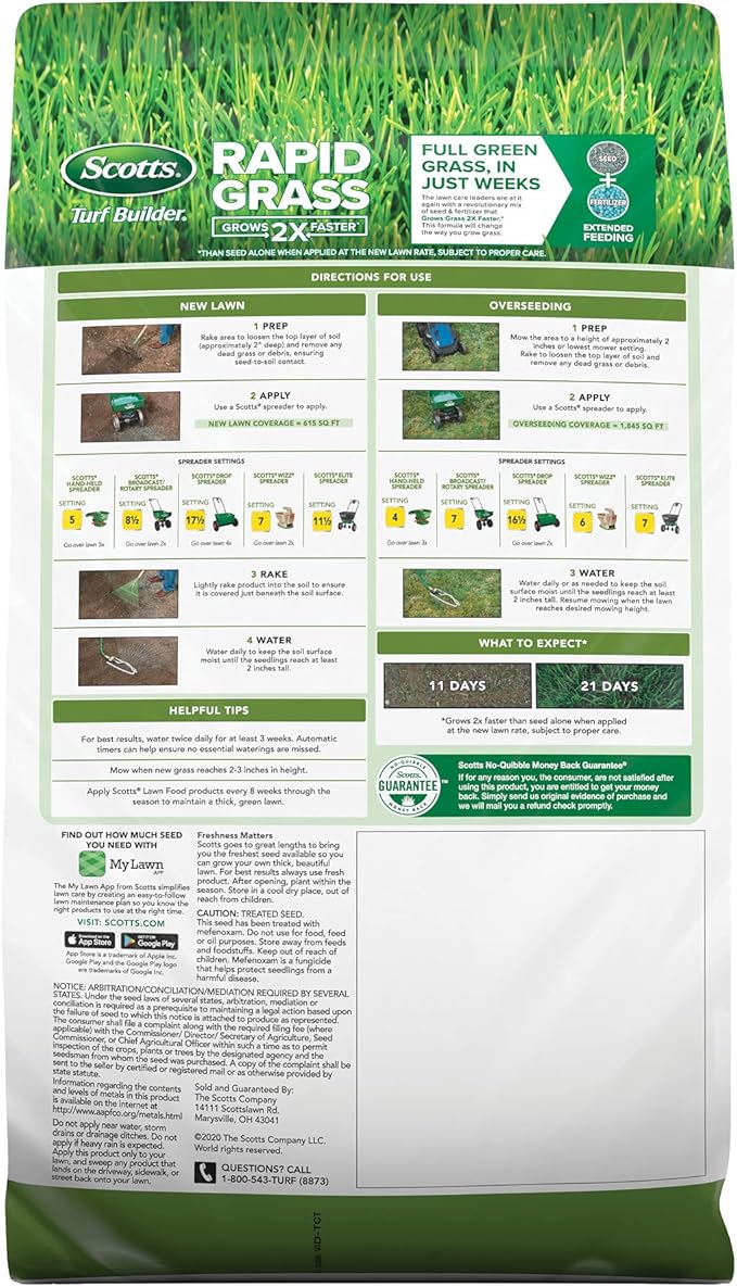 - Fast Growing Grass Seed: Scotts Turf Builder Rapid Grass Tall Fescue Mix grows grass 2X faster than seed alone (when applied at the new lawn rate, subject to proper care)