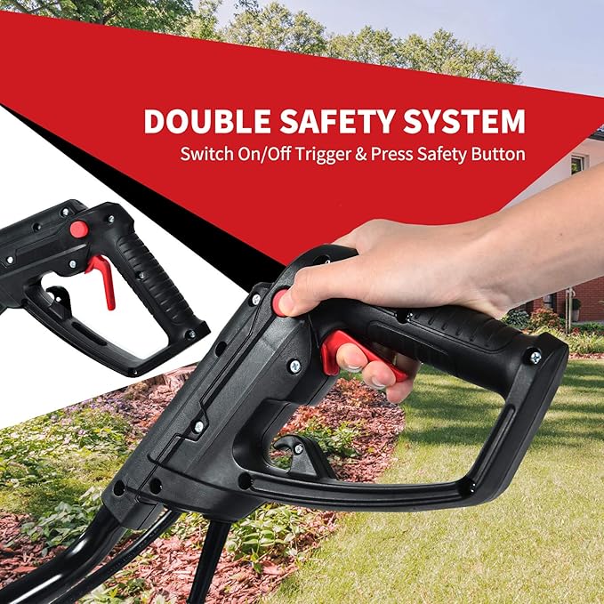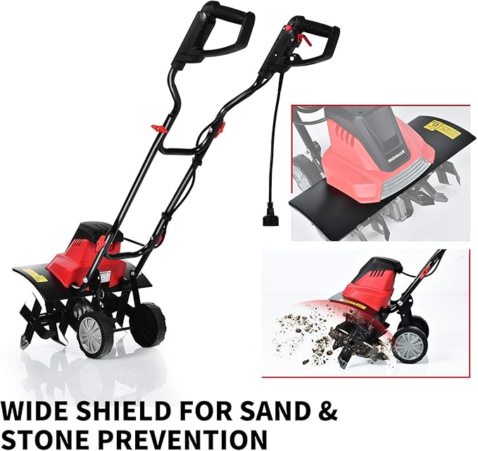 - 【Double Safety System】To safely start the machine, the tiller cultivator is equipped with ON/OFF trigger and press safety button, allowing you to walk safely and freely between weeds and plants. The strong and wide shield prevents sand and stone splashes from hurting people, especially in high-intensity gardening work.