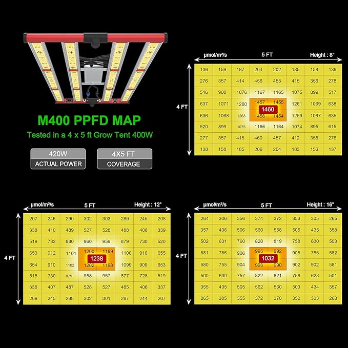 - High PPFD Grow Light for Better Yields - This 420W grow light uses 1360 SMD LEDs, delivering up to 1238 μmol/㎡/s PPFD across a 4x5 ft area. It provides strong, uniform lighting that supports healthy plant growth and higher yields, with efficiency up to 2.5 g per watt under optimal conditions.