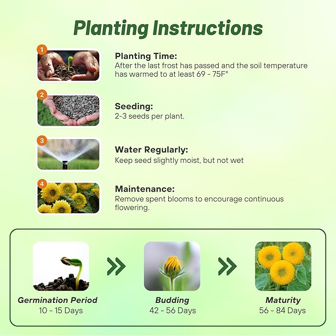 - SIMPLE PLANTING PROCESS: These seeds for planting flowers are easy to grow! Sow our seed pack directly into the soil after frost, place 2-3 sunflower seeds for planting every 12 inches, and thin to 24 inches for optimal growth. With straightforward care requirements, they are a great option for both beginners and seasoned gardeners.
