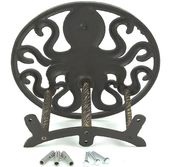 Cast Iron 12 inch Octopus Decorative Wall Mounted Hanging Garden Hose Hanger Bronze Finish - 125 ft Hose Holder Capacity - Nautical Sea Life Outdoor Décor