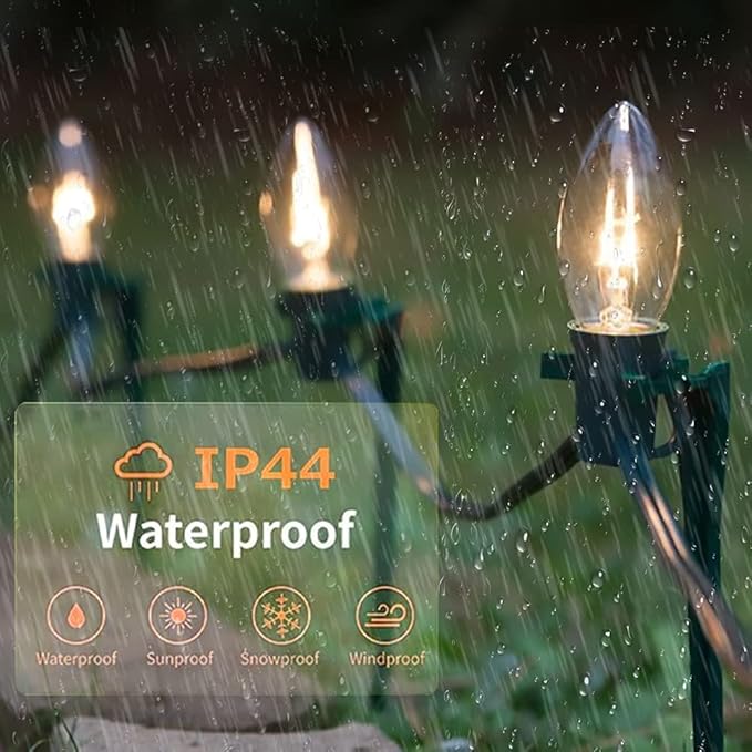 - Christmas String Lights: C9 traditional Christmas string light is made of a high quality 20 AWG wire and a 5 amp fuse that will stand up to any weather and also can be used outdoor & indoors. Rating of IP44 weather resistant, so the outdoor string lights could be used to your garden or other outdoor place when the weather is sunny withstand light rain or water spills