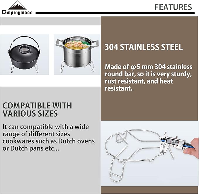 - CAMPINGMOON's campfire cooking stand is made of solid rod stainless steel, can be used for pots, pans, Dutch oven, lid etc... This cooking tripod is very sturdy, rust resistant, and heat resistant. Very suitable for campfire cooking.