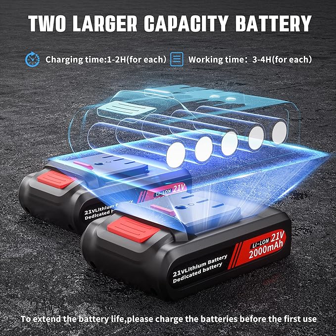 - 【Long Life Rechargeable Lithium Batteries】- The electric shears has 2 pack 21V, 2Ah rechargeable lithium batteries, long battery life, 1.5 hours fast charging, continuously working cut about 6000 times after being fully charged.The two batteries can be used in turn.( Notice: The batteries are not fully charged, please charge the batteries before the first use.)