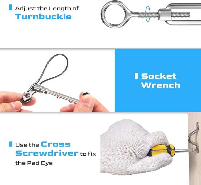 - 【Easy Installation】-It’s sturdy outdoor light guide wire winding around the coil bobbin to prevent tangling. Each part is connected by thread, easy adjust wire rope cable tension using the push-button on snap hook and you can disassemble with your own hands