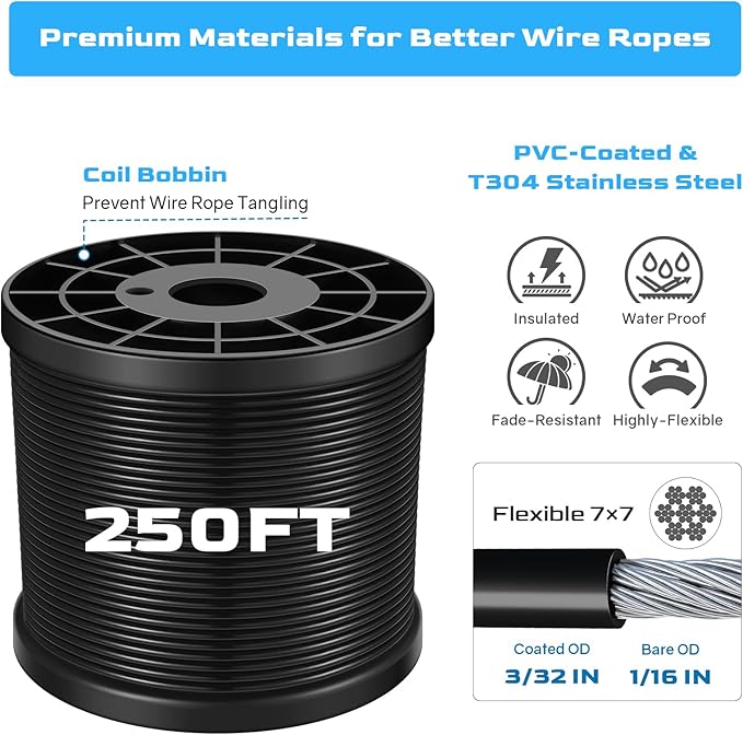 - 【High Quality Material】-This string light kit is made of US ASTM standard 304 stainless steel, 7 x 7 strands construction, bare OD is 1/16",coated OD is 3/32". The Coated Stainless Steel Cable is Insulated and waterproof, rust-resistant and able to bear any bad weather condition like intensive sun exposure and heavy rain. 480lbs breaking strength ensures its outstanding durability and long-lasting secure hold for the string lights without snagging once pulled tightly
