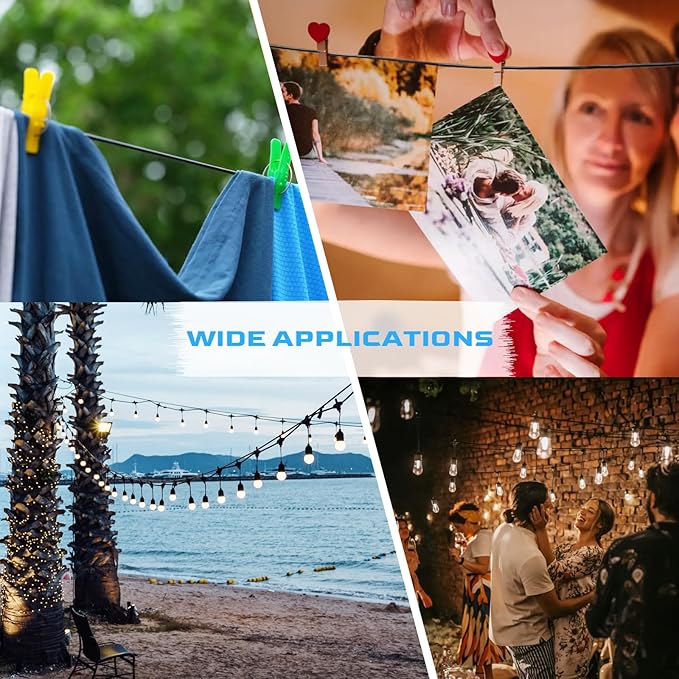 - 【Wide Application】-Our guide wire for string lights can be used in multiple ways such as This product is suitable for patio string light kit, string light pole, photo frames, clothes, shade sails. You can shape different lighting suspension types to enhance the visual effect according to different of occasion, indoor or outdoor. Using your imagination, Decoration, create Atmosphere and enjoy the fun of DIY