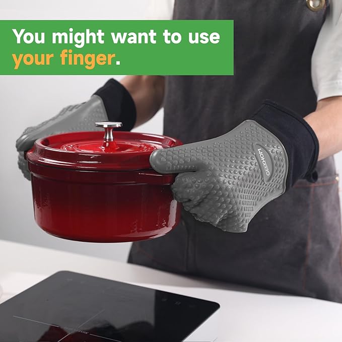 - Effortless Cleanup, Smarter Kitchen Flow: Waterproof silicone repels hot grease and marinade spills, while dishwasher-safe design erases stains in minutes; Hang the oven gloves compactly with the built-in loop—ideal for small kitchen spaces or tossing into camping gear without bulk