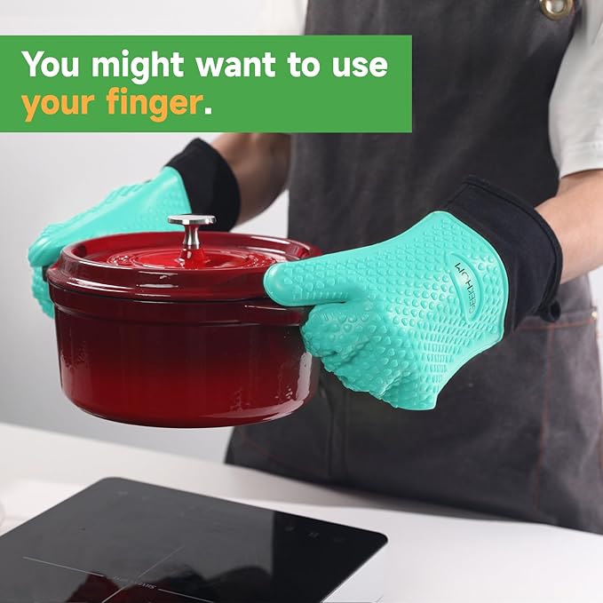 - Effortless Cleanup, Smarter Kitchen Flow: Waterproof silicone repels hot grease and marinade spills, while dishwasher-safe design erases stains in minutes; Hang the oven gloves compactly with the built-in loop—ideal for small kitchen spaces or tossing into camping gear without bulk