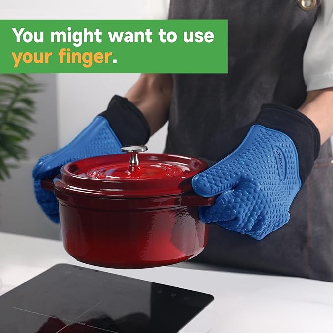 - Effortless Cleanup, Smarter Kitchen Flow: Waterproof silicone repels hot grease and marinade spills, while dishwasher-safe design erases stains in minutes; Hang the oven gloves compactly with the built-in loop—ideal for small kitchen spaces or tossing into camping gear without bulk
