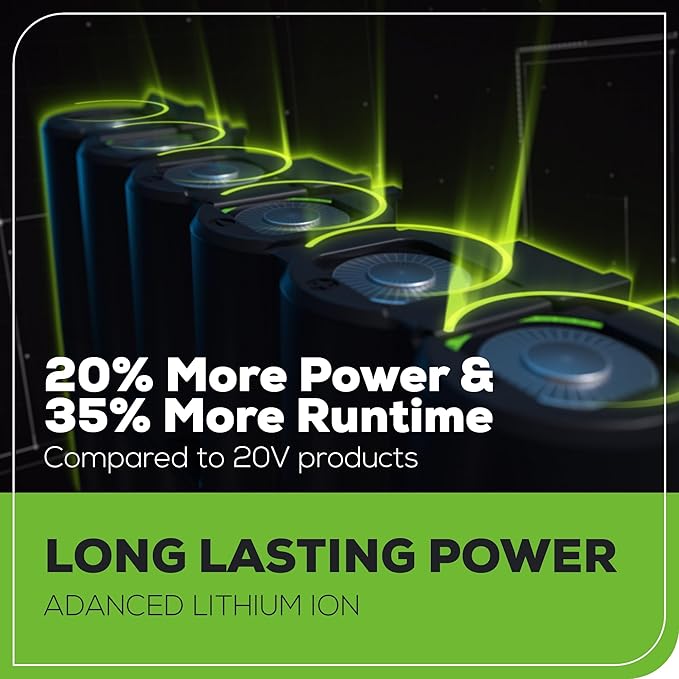 - 【Highly Efficient Brushless Motor & 2×2Ah Batteries】 delivers more power at 2X More Torque, cooler operation at high speeds, enhanced battery runtime and longer service life. 2×2Ah batteries can ensure that your Greenworks tool is always ready for use when you are.24V Lithium-Ion battery provides 20% more power and 35% more run-time versus 20V competition, and delivers fade-free power with no memory loss after charging.
