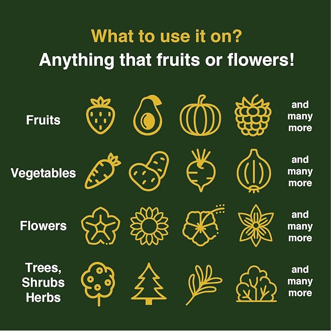 - Use on all flower / fruit / vegetable producing plants (we've seen amazing results with citrus trees, avocados, raspberries, cantaloupe, roses, petunias, etc… but this formula will work on a wide range of plants)