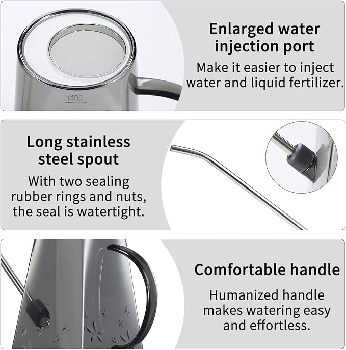 - [IDEAL WATERING CAN]: The plant watering can has storage capacity of 47 oz, which is enough to water several indoor plants; the enlarged opening makes the injection of water more convenient; the stainless steel long spout is very convenient watering to the roots of the plants.