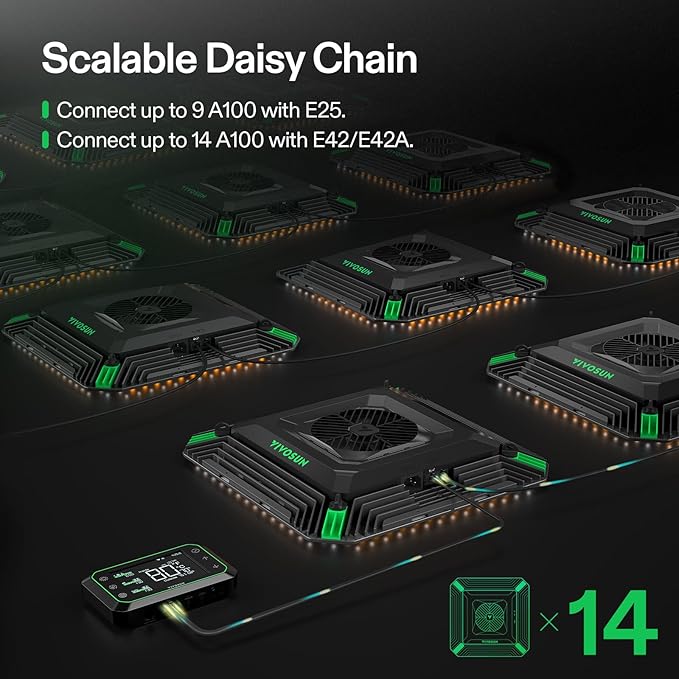 - Integrated Circulation Fan: The centrally located circulation fan in the LED balances airflow where other fans cannot reach, allowing more air to enter the canopy directly; To unlock additional features, the fan must be used with the Vivosun Growhub Controller (E42A/E25), available for separate purchase