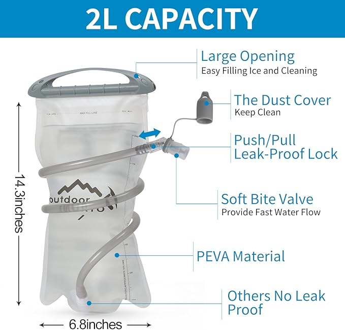 - đ´âăPremium Quality Water BladderăThe Hydration Pack Backpack comes with a 2 liter hydration water bladder and two 250ml soft flask. A switch valve and a cover cap make double leak-proof. Large opening allows quick filling of water and ice and it is easy to clean, the water line (40"length,0.4"diameter) provides a wholesome flow for easy drinking keeps your water tasting fresh, all day. The water temperature is range -20~+50â.